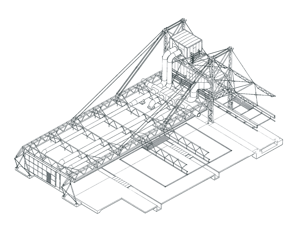 سقف شامل 10 دال بتنی پیش تنیده معلق است که بوسیله نورگیرهای سقفی مثلقی شکل از هم جدا می شوند